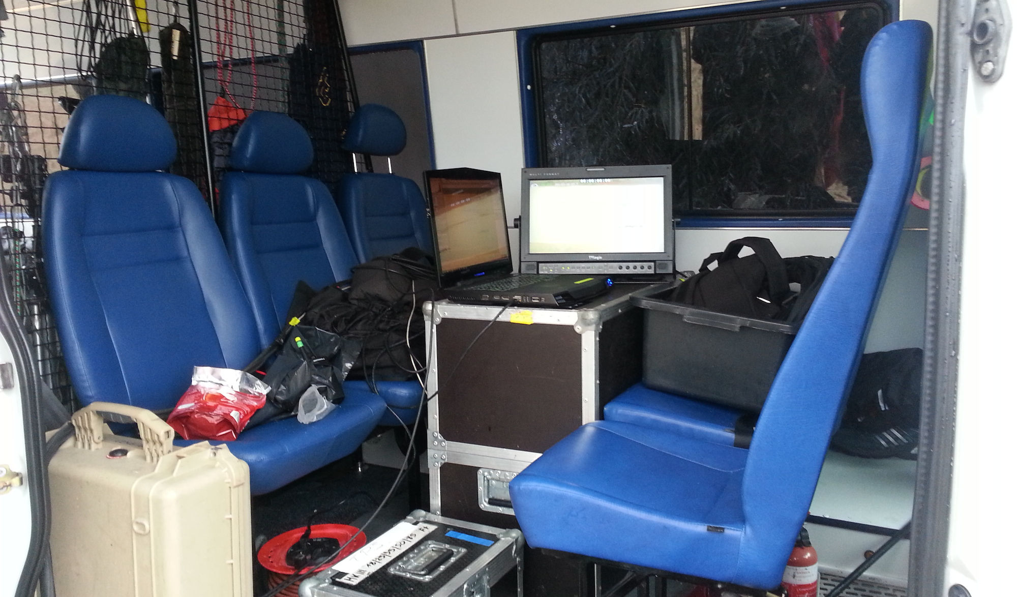 Możliwość przewożenia 8 osób to dodatkowy atut, który szczególnie przy mniejszych produkcjach telewizyjnych pozwala na znaczne oszczędności. Samochód wyposażony jest w system ogrzewania postojowego Webasto oraz klimatyzację postojową dzięki którym możemy komfortowo pracować wewnątrz pojazdu niezależnie od warunków pogodowych. Instalacja prądu zmiennego zapewnia podwójną stabilizację napięcia, dzięki której wrażliwe urządzenia takie jak dyski twarde czy komputery są podwójnie zabezpieczone przez uszkodzeniem. Markiza boczna pozwala stworzyć stanowisko podglądowe, DIT, lub po prostu bazę sprzętową poza pojazdem, co znacznie ułatwia dostęp i skraca czas pracy.